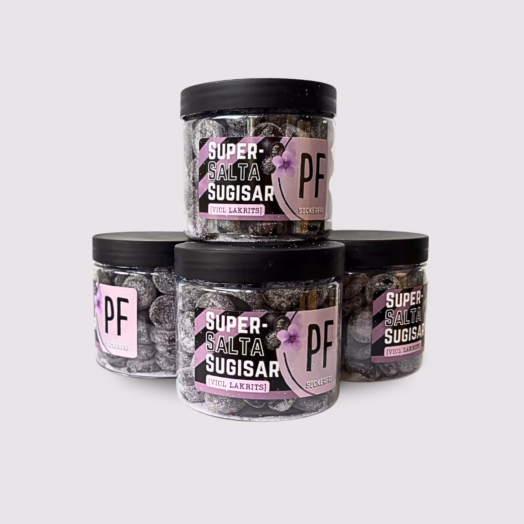 Vi presenterar nu stolt det senaste tillskottet i vår supersalta serie: Supersalta Sugisar Viol Lakrits! En perfekt balanserad kombination av blommig viol och fyllig rålakrits och ett generöst lager supersalt salmiakpulver.