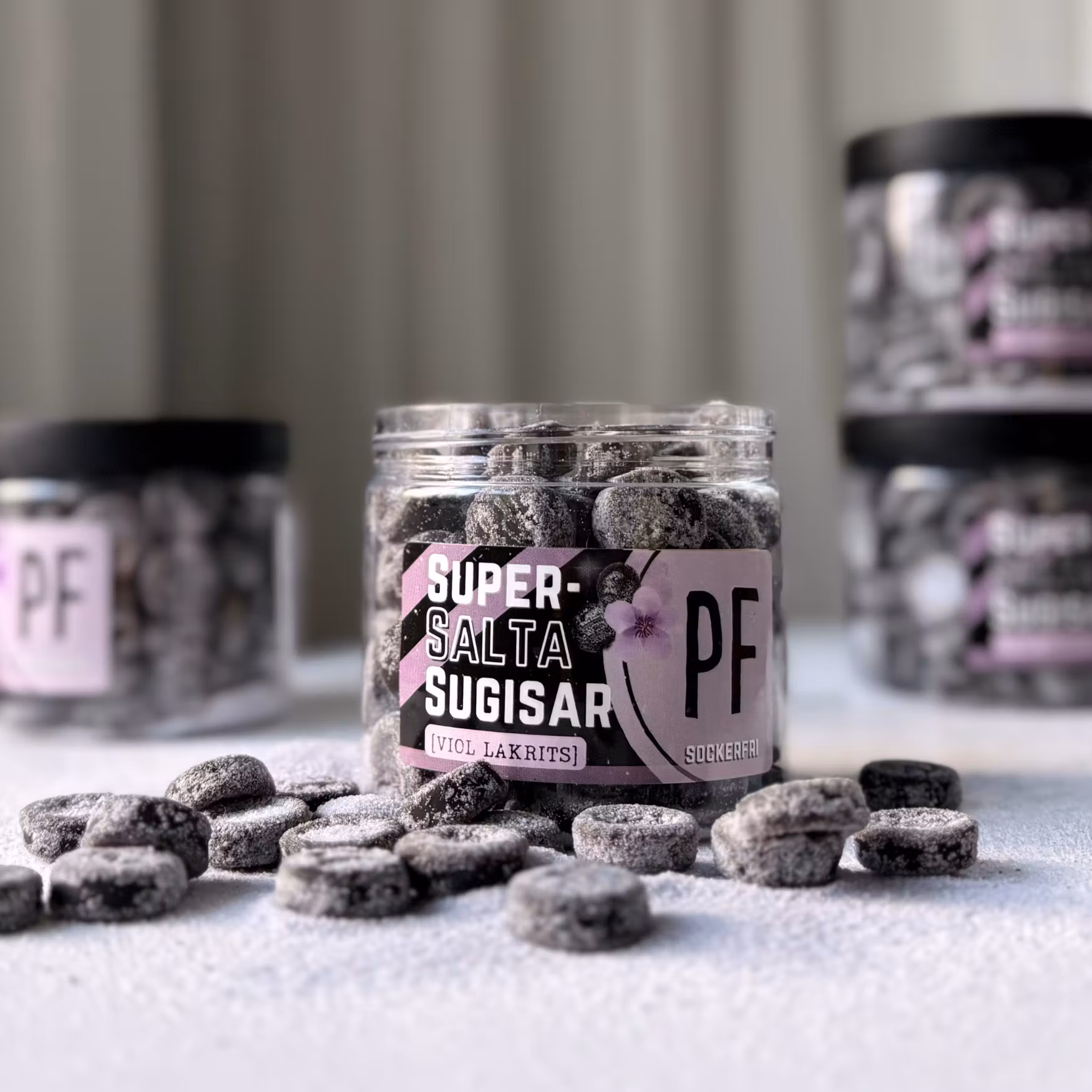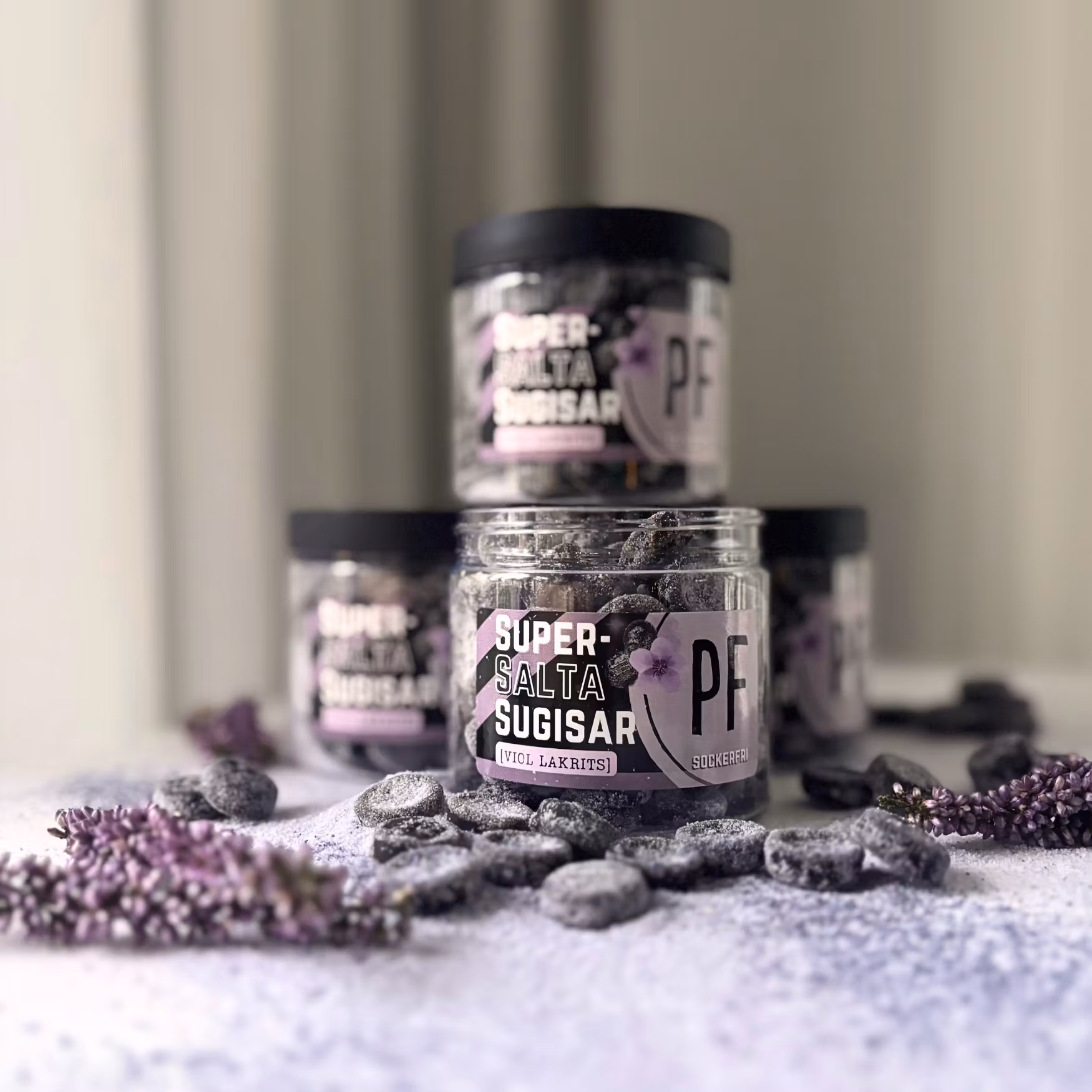 Vi presenterar nu stolt det senaste tillskottet i vår supersalta serie: Supersalta Sugisar Viol Lakrits! En perfekt balanserad kombination av blommig viol och fyllig rålakrits och ett generöst lager supersalt salmiakpulver.